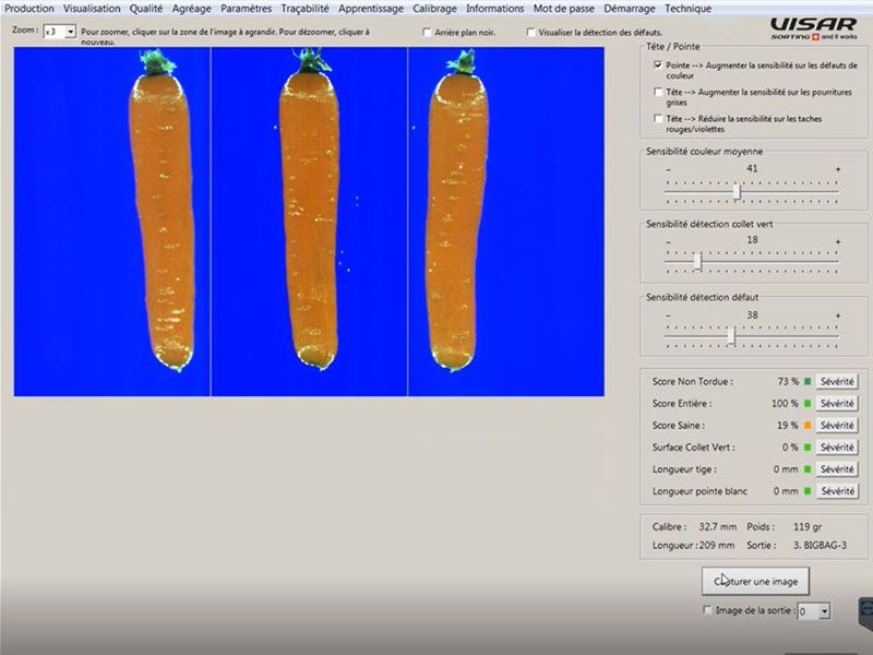The principle is based on artificial intelligence, which enables the subjective evaluation of the quality, shape and appearance of each carrot and thereby replicates the human appreciation. Combined with other measurable criteria (green collar area, white tip length, stem length), this setting allows the fine-tuning of the sorting accuracy.
