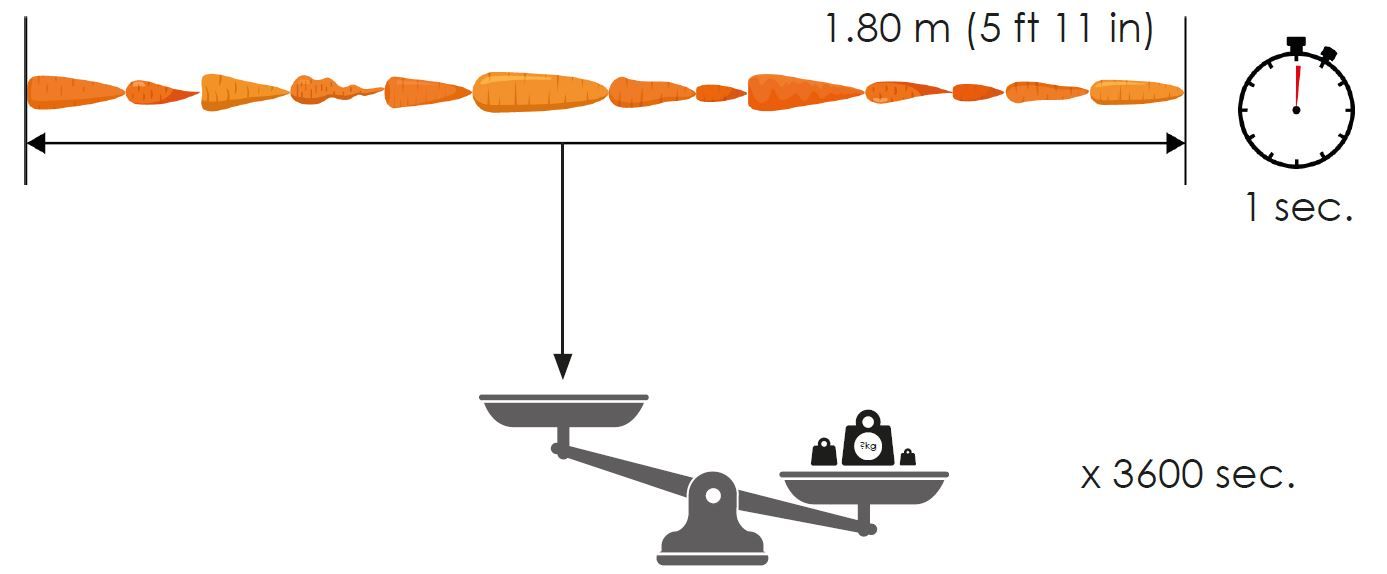 The weight of 1.80 m (5 ft 11 in) carrots per second extrapolated to one hour results in the hourly sorting capacity.