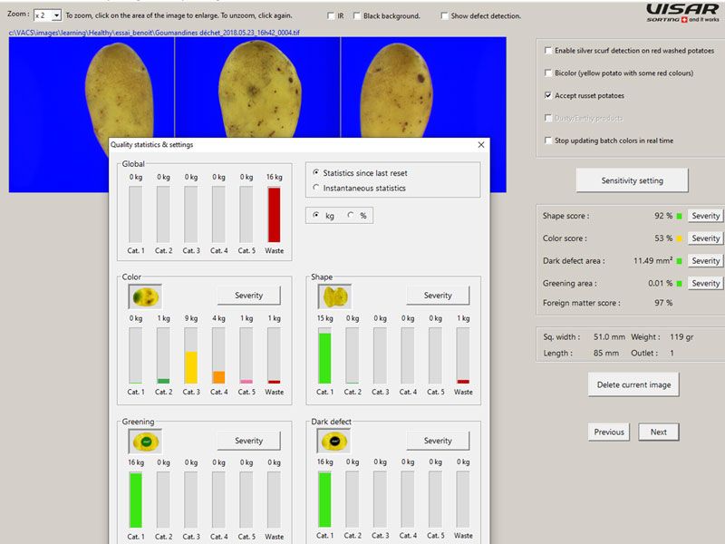 The principle is based on artificial intelligence, which enables the subjective evaluation of the quality, shape and appearance of each potatoe and thereby replicates the human appreciation. Combined with other measurable criteria (the slightest defects such as wireworm damage for example), this setting allows the fine-tuning of the sorting accuracy.