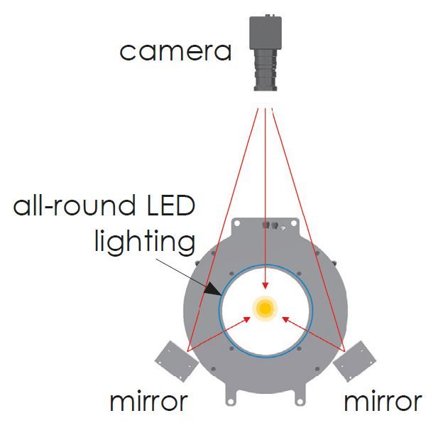 Thanks to a mirror system and a very powerful all-round lighting that eliminates shadows, every vegetable is subjected to a perfect 360° analysis. The optical system generates 3 immaculate high-resolution images of each potatoe. These can be displayed immediately on the computer screen to check the error detection.