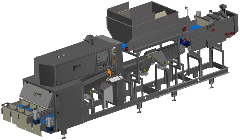 The machine is equipped with 6 outputs: 5 of them can be freely parameterized and one is used for the waste. The products of each exit are passed onto individual conveyor belts. The sorting criteria can easily be adapted to the specific needs of each customer.